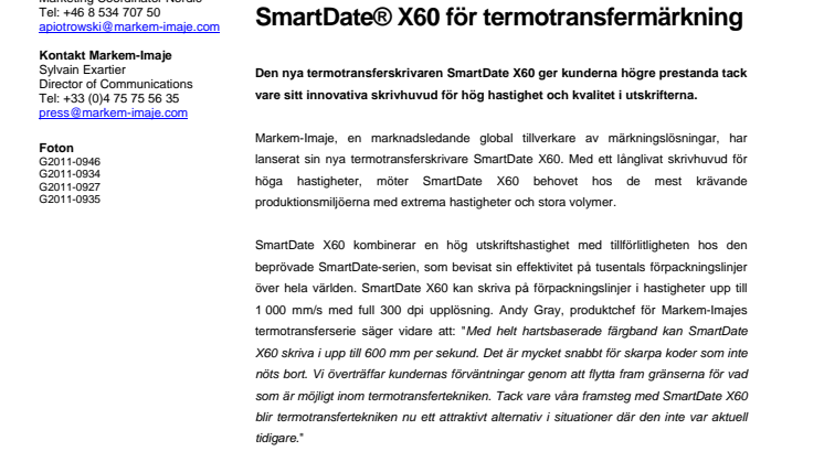 SmartDate X60 kombinerar en hög utskriftshastighet med tillförlitligheten hos den beprövade SmartDate-serien, som bevisat sin effektivitet på tusentals förpackningslinjer över hela världen. SmartDate X60 kan skriva på förpackningslinjer i hastigheter upp till 1 000 mm/s med full 300 dpi upplösning. Andy Gray, produktchef för Markem-Imajes termotransferserie säger vidare att: "Med helt hartsbaserade färgband kan SmartDate X60 skriva i upp till 600 mm per sekund. Det är mycket snabbt för skarpa koder som inte nöts bort. Vi överträffar kundernas förväntningar genom att flytta fram gränserna för vad som är möjligt inom termotransfertekniken. Tack vare våra framsteg med SmartDate X60 blir termotransfertekniken nu ett attraktivt alternativ i situationer där den inte var aktuell tidigare."