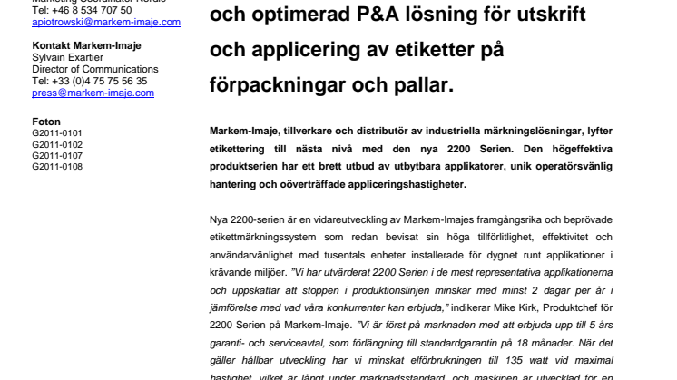 Markem-Imaje introducerar nya 2200 Serien - en effektiv, tillförlitlig och optimerad P&A lösning för utskrift och applicering av etiketter på förpackningar och pallar