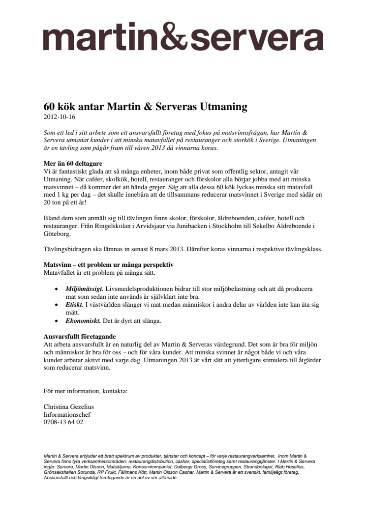Som ett led i sitt arbete som ett ansvarsfullt företag med fokus på matsvinnsfrågan, har Martin & Servera utmanat kunder i att minska matavfallet på restauranger och storkök i Sverige. Utmaningen är en tävling som pågår fram till våren 2013 då vinnarna koras. Nu har anmälningstiden gått ut och vi kan meddela att mer än 60 kök antagit utmaningen.