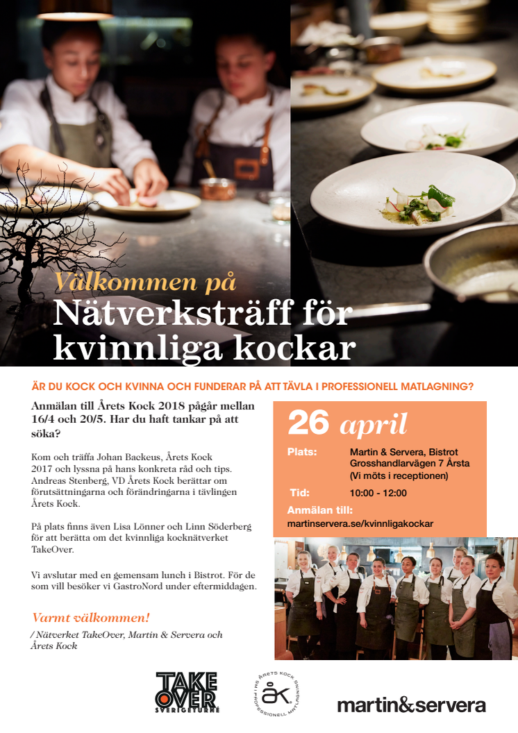Den som är kock och kvinna och intresserad av att tävla i professionell matlagning hälsas välkommen till en nätverksträff hos Martin & Servera. Årets Kock 2017, Johan Backeus, inspirerar och ger råd. Detta är ett samarrangemang mellan nätverket TakeOver, Årets Kock och Martin & Servera.