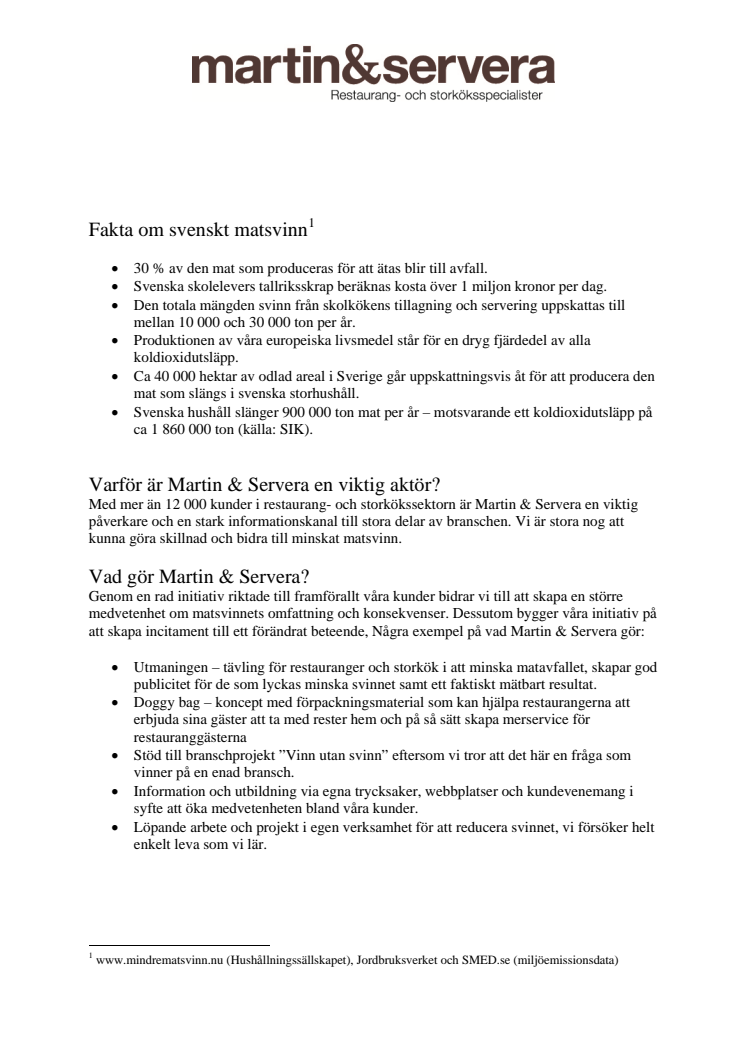 PM med fakta om matsvinn i restauranger och storkök samt en lista över de aktiviteter som Martin & Servera påbörjat som ett steg i utvecklingen mot mindre matavfall i svenska restauranger och storkök.