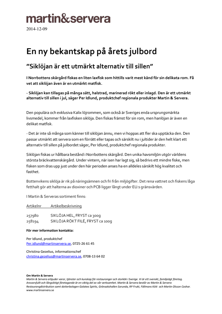 - Siklöjan kan tillagas på många sätt, halstrad, marinerad rökt eller inlagd. Den är ett utmärkt alternativ till sillen i jul, säger Per Idlund, produktchef regionala produkter Martin & Servera.