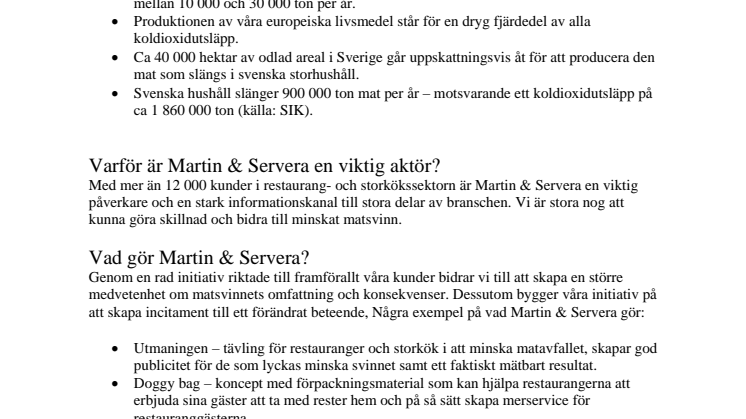 Därför har Martin & Servera beslutat att under 2013 lägga fokus på just svinn. Vi utvecklar Utmaningen, vi jobbar extra hårt med att minska svinnet i vår egen verksamhet och vi har för avsikt att skapa ett ”doggy-bag-koncept” i syfte att hjälpa restauranger i Sverige minska sitt matavfall.