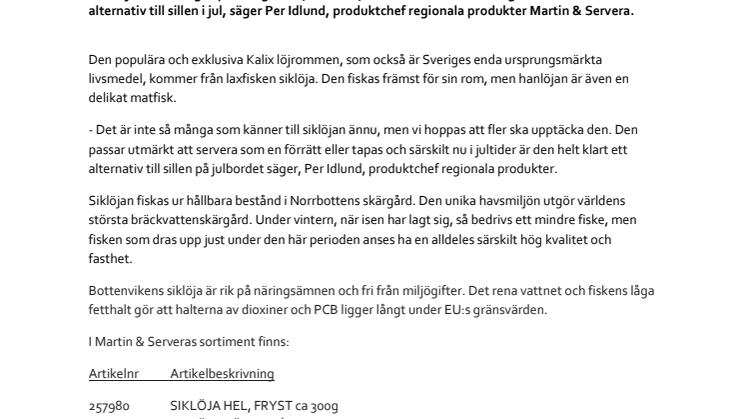 - Siklöjan kan tillagas på många sätt, halstrad, marinerad rökt eller inlagd. Den är ett utmärkt alternativ till sillen i jul, säger Per Idlund, produktchef regionala produkter Martin & Servera.