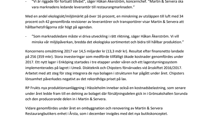 Restaurang- och storkökskoncernen Martin & Serveras års- och hållbarhetsberättelse för 2017 publiceras idag. Den visar på ett år präglat av hög utvecklingstakt, stora investeringar och viktiga steg i hållbarhetsarbetet.
