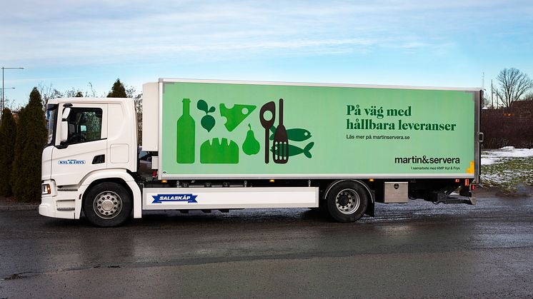 - Martin & Servera har idag distribution via tre elhybridlastbilar. Dessa bilar utgår från Stockholm, Enköping och Norrköping. Två är egna bilar, en är en gemensam satsning tillsammans med underleverantör Älta Transportservice.