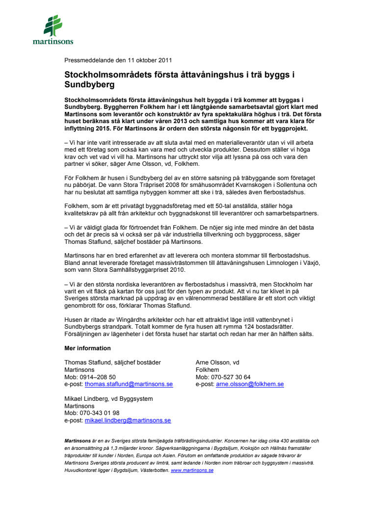 Byggherren Folkhem har i ett långtgående samarbetsavtal gjort klart med Martinsons som leverantör och konstruktör av fyra spektakulära åttavåningshus, som blir de första i Stockholmsområdet som byggs i trä. Det första huset kommer att stå klart under våren 2013. För Martinsons är ordern den största någonsin för ett byggprojekt.