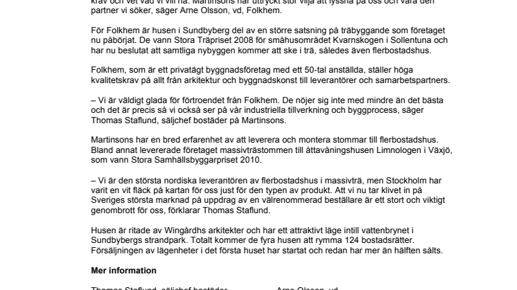 Stockholmsområdets första åttavåningshus helt byggda i trä kommer att byggas i Sundbyberg. Byggherren Folkhem har i ett långtgående samarbetsavtal gjort klart med Martinsons som leverantör och konstruktör av fyra spektakulära höghus i trä. Det första huset beräknas stå klart under våren 2013 och samtliga hus kommer att vara klara för inflyttning 2015. För Martinsons är ordern den största någonsin för ett byggprojekt.