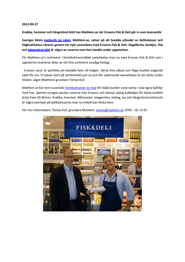 Sveriges bästa matbutik på nätet, MatHem.se, satsar på att bredda utbudet av delikatesser och högkvalitativa råvaror genom ett nytt samarbete med Erssons Fisk & Deli. Dagsfärska skaldjur, fisk och hängmörat kött är några av varorna man kan handla under uppstarten.