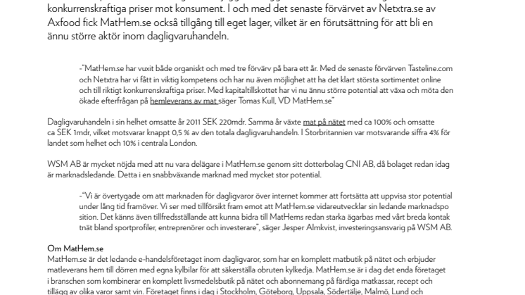 - “Vi är övertygade om att marknaden för dagligvaror över internet kommer att fortsätta att uppvisa stor potential under lång tid framöver. Vi ser med tillförsikt fram emot att MatHem.se vidareutvecklar sin ledande marknadsposition. Det känns även tillfredsställande att kunna bidra till MatHems redan starka ägarbas med vårt breda kontaktnät bland sportprofiler, entreprenörer och investerare”, säger Jesper Almkvist, investeringsansvarig på WSM AB.