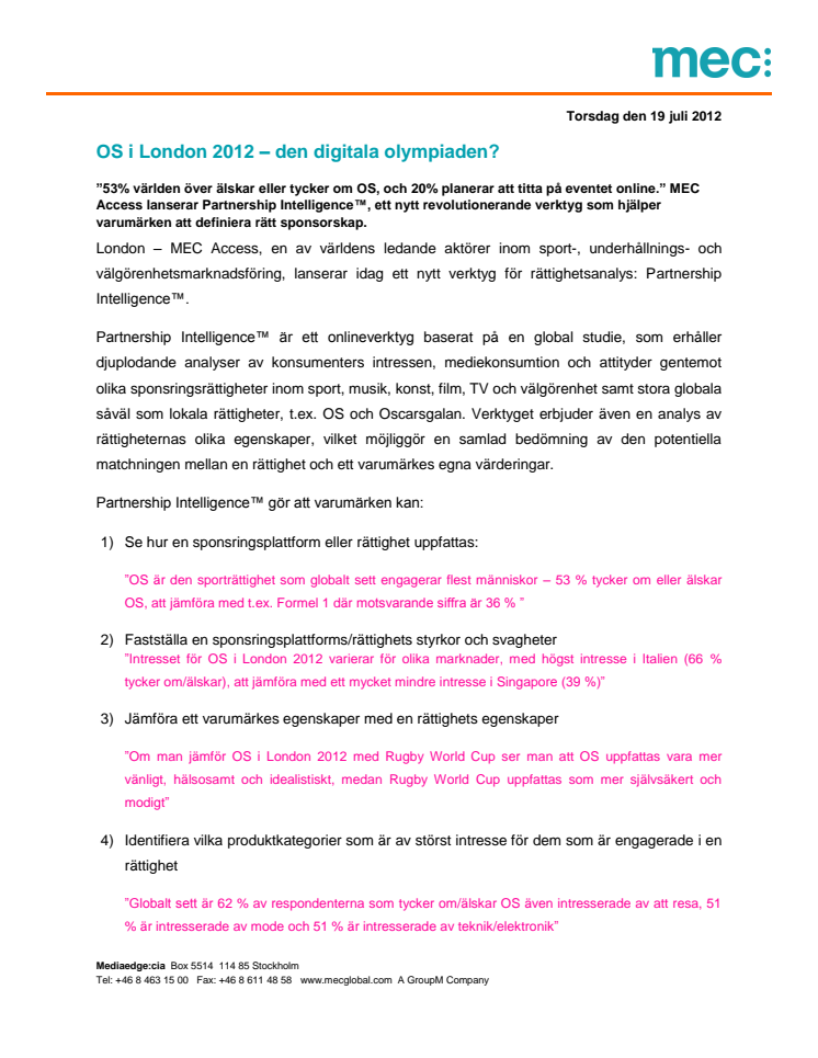 ”53% världen över älskar eller tycker om OS, och 20% planerar att titta på eventet online.” MEC Access lanserar Partnership Intelligence™, ett nytt revolutionerande verktyg som hjälper varumärken att definiera rätt sponsorskap.