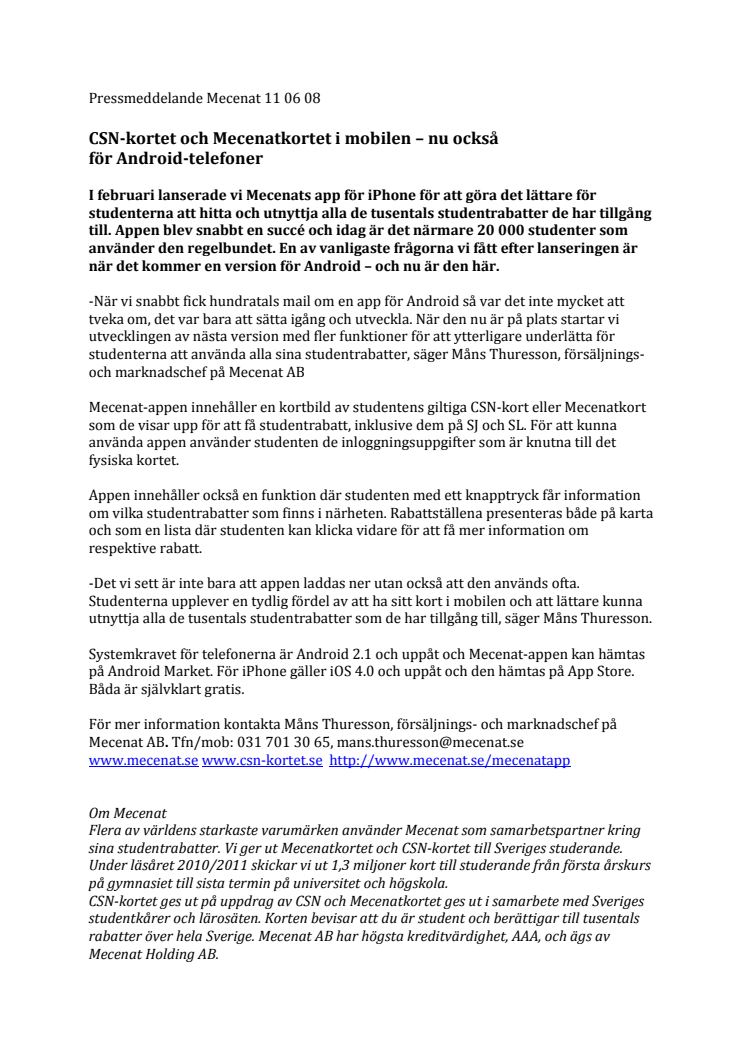 CSN-kortet och Mecenatkortet i mobilen – nu också för Android-telefoner