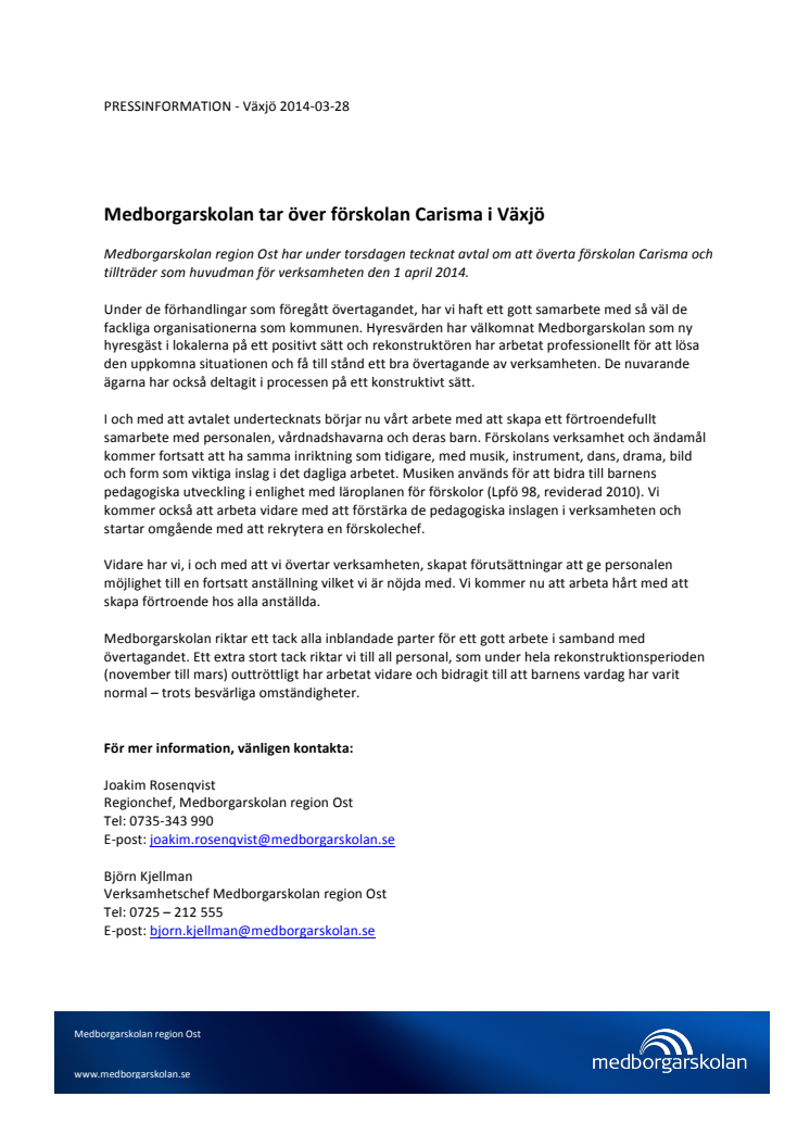 Medborgarskolan region Ost har tecknat avtal om att överta förskolan Carisma och tillträder verksamheten den 1 april 2014.