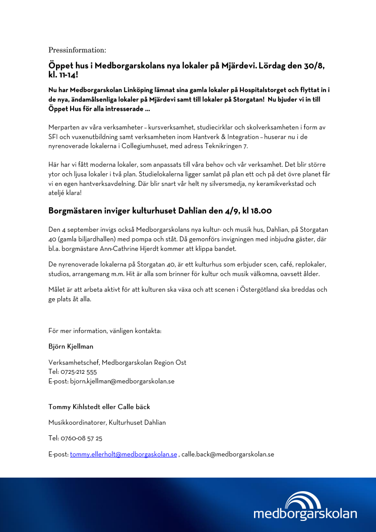Öppet hus i Medborgarskolans nya lokaler på Mjärdevi. Lördag den 30/8, kl. 11-14!