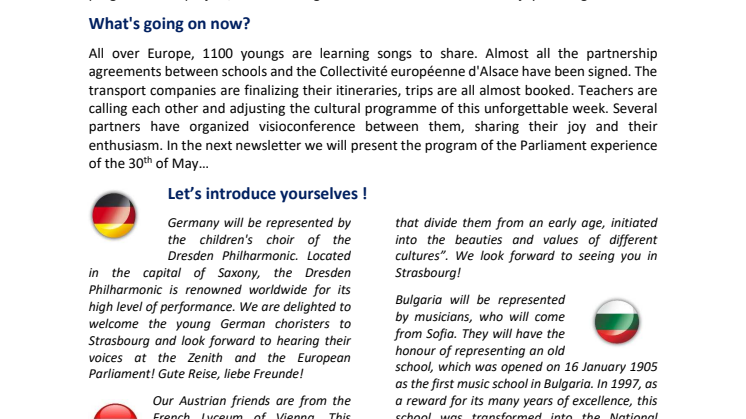 Just nu övar skolor runt om i Europa enskilt samt tillsammans med körledare Luciano Biblioni från Orchestre du Rhin/Opéra National du Rhin, Strasbourg. Ungdomarna kommer bland annat sjunga Adiemus (Jenkins), Vers le Futur (Di Gusto) och Hymne à la Joie (van Beethoven).