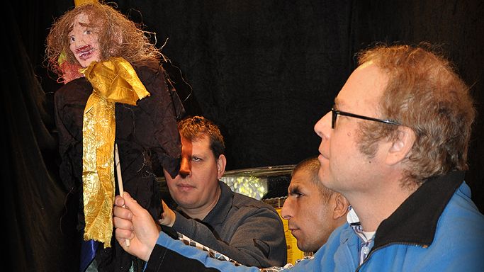 Bilden visar personer från den dagliga verksamheten Eldorado som presenterar dockteatern Ett Annorlunda Verk.
