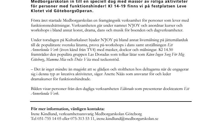 Torsdagen den 18 augusti på Göteborgs Kulturkalas bjuder Medborgarskolan in till en speciell dag med massor av roliga aktiviteter för personer med funktionshinder! Kl 14-19 finns vi på festplatsen Leve Klotet vid GöteborgsOperan.