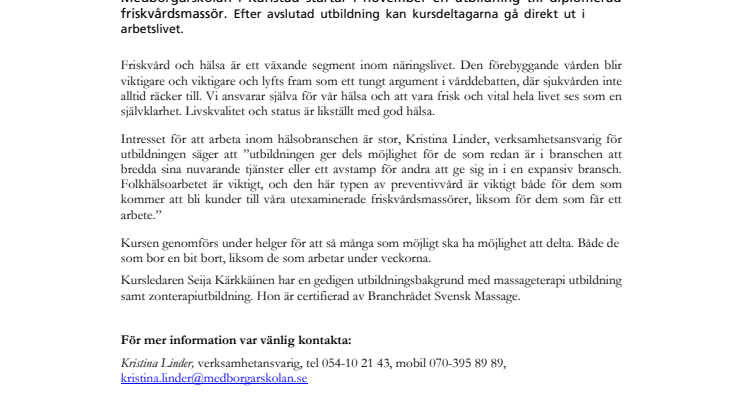 Medborgarskolan i Karlstad startar i november en utbildning till diplomerad friskvårdsmassör. Efter avslutad utbildning kan kursdeltagarna gå direkt ut i arbetslivet.