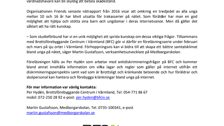 Föreläsningen hålls av Per Hydén som arbetar med antidiskrimineringsfrågor på BFC och kommer bland annat innehålla information om vilka lagar och regler som gäller på internet utifrån ett diskrimineringsperspektiv samt vad som är brottsligt och kränkande beteende och hur föräldrar och skolpersonal kan hantera och förebygga kränkningar bland unga på internet.
