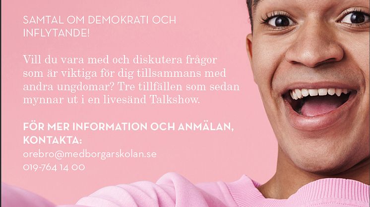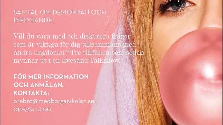 Ungdomar finner det ofta svårt att göra sin röst hörd och att deras åsikt inte har någon betydelse. Medborgarskolan har initierat ett projekt som syftar till att öka ungdomars engagemang för demokrati och politik. Projektet kommer starta med demokratisamtal som sedan mynnar ut i en livesänd Talkshow, där frågor utifrån ungdomarnas önskemål kommer lyftas.