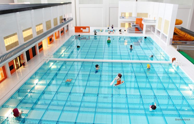 Järfällas nya simhall invigs våren 2018. Nu finns en skalenlig modell på plats i entrén till befintliga Jakobsbergs simhall.