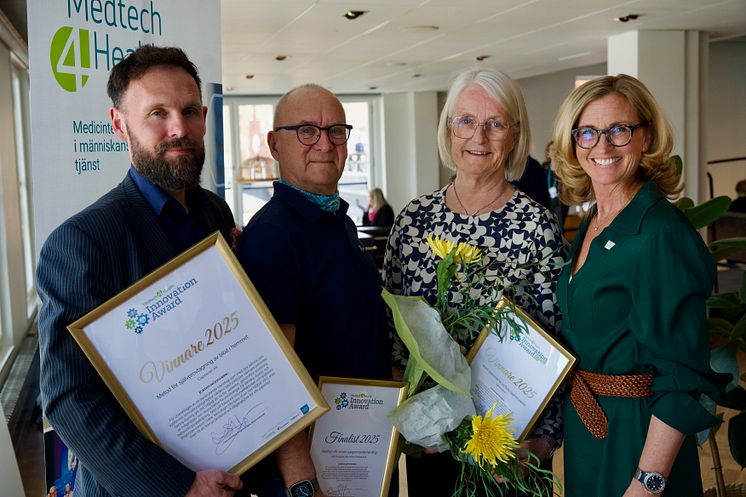 Finalister i Innovation Award 2025, Mathias Karlsson, Capitainer, Leif Dahlberg, Joint Academy, Barbro Cagner, Njord Medtech med programdirektör Lena Strömberg.