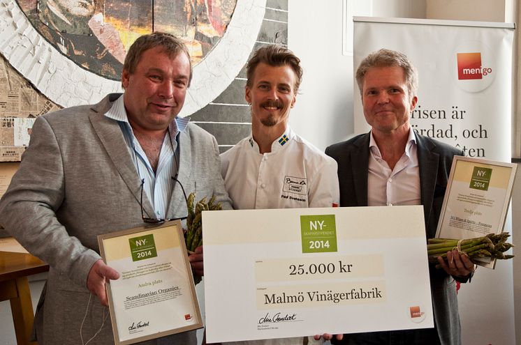 Från vänster: Nils Wetterlind från Scandinavaian Organics (2:a plats), Paul Svensson håller vinnaren Malmö Vinägerfabriks check och Jan Rothman från XO Wines & Spirits (3:e plats).