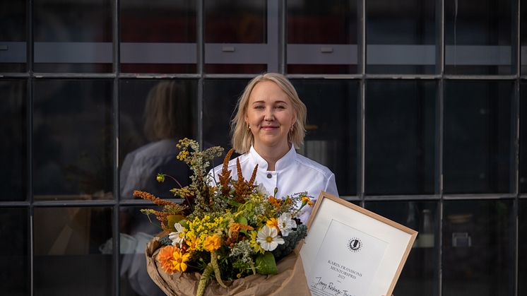 Jenny Roshage Theander från Näsby Slott tilldelas Karin Franssons mentorspris 2021. Utmärkelsen belönar årligen mentorer som bidragit till att lyfta och utveckla kvinnliga kockar.