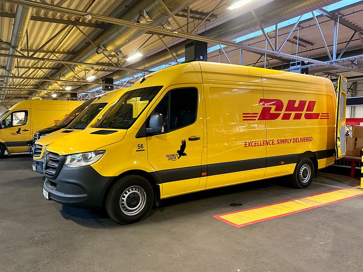 Mercedes-Benz eSprinter i Falkenklevs/DHLs färger.