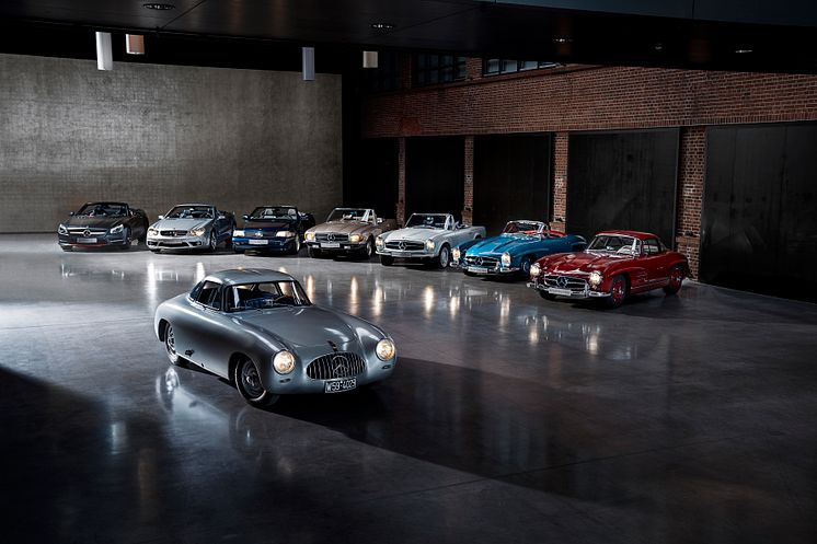 Längst fram: Mercedes-Benz 300 SL racing sports car 1952 (W 194). I bakgrunden från höger till vänster : Mercedes-Benz 300 SL Coupé 1957 (W 198), Mercedes-Benz 300 SL Roadster 1960 (W 198), Mercedes-Benz 280 SL Pagoda 1970 (W 113), Mercedes-Benz 350 SL 1971 (R 107), Mercedes-Benz SL 600 1995 (R 129), Mercedes-Benz SL 55 AMG 2005 (R 230), Mercedes-Benz SL 500 Special Edition "Mille Miglia 417" 2015 (R 231).