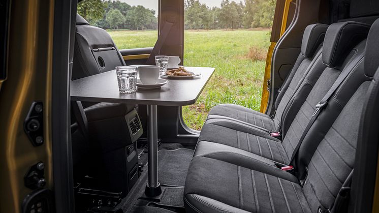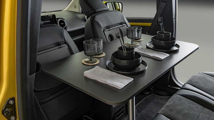 Här finns också ett bord med två stolar. Bordet kan dels användas utomhus men kan också monteras i baksätet så att det går att äta eller jobba under tak.
