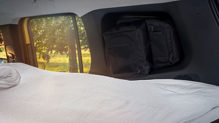 En säng på 2 x 1,5 m med extra tjock madrass förvaras hopvikt i bilens bagageutrymme under körning. När det är dags att sova viks den framåt över baksätena som då fälls framåt.