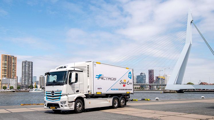Först ut var Simon Loos som kör en eActros med avställbart kylskåp i Haag sedan början av augusti. Bilen går ca 20 mil om dagen, och både lastbil och kylaggregat är helt eldrivna. Det betyder att om den laddas med grön el så körs den helt CO2-nutralt.