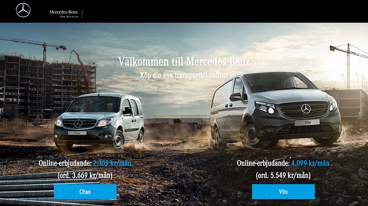 Mercedes-Benz blir först i Sverige med att erbjuda online-försäljning av transportbilar. Försäljningen på webben gäller de populära modellerna Vito och Citan och kostnaden blir lägre än för motsvarande nybeställning. Erbjudandet är uppbyggt som operationell leasing och blir transportbilsvärldens motsvarighet till privatleasing, utan kontantinsats och utan risk. Premiär sker idag, den 1 juni.