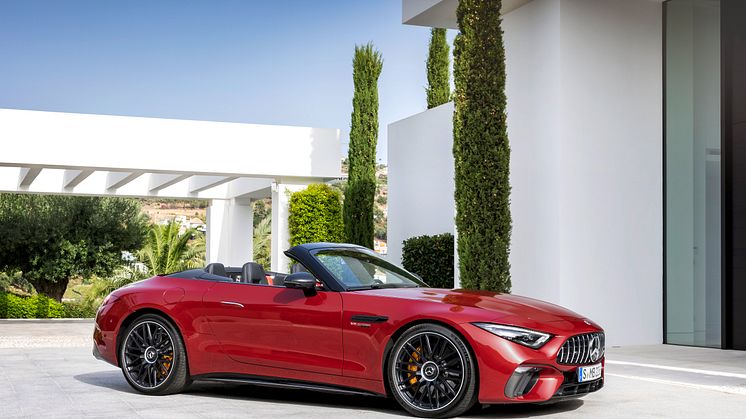 SL 55 4MATIC+ levererar 476 hk och ett maximalt vrid på 700 Nm. 0 -100 går på 3,9 sekunder och toppfarten anges till 295 km/tim.