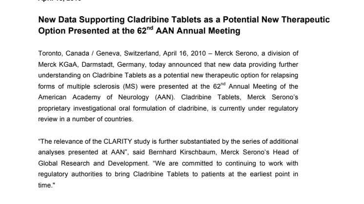 Toronto, Canada / Geneva, Switzerland, April 16, 2010 – Merck Serono, a division of Merck KGaA, Darmstadt, Germany, today announced that new data providing further understanding on Cladribine Tablets as a potential new therapeutic option for relapsing forms of multiple sclerosis (MS) were presented at the 62nd Annual Meeting of the American Academy of Neurology (AAN). Cladribine Tablets, Merck Serono’s proprietary investigational oral formulation of cladribine, is currently under regulatory review in a number of countries.