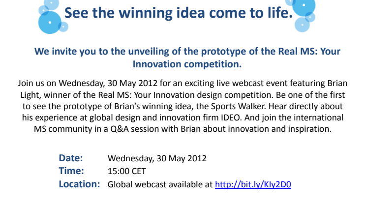 Your Innovation marks the second and final phase of the Real MS campaign, launched by Merck Serono in 2010 to build a greater understanding of MS and stimulate a hopeful message around navigating life with MS. The first competition, Your Story, featured a global script-writing competition that resulted in a short film about life with MS.