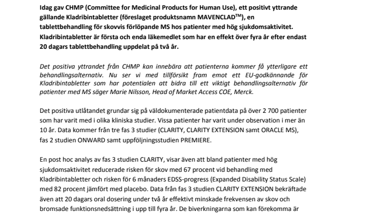 Idag gav CHMP (Committee for Medicinal Products for Human Use), ett positivt yttrande gällande kladribin tabletter (föreslaget produktsnamn MAVENCLAD (TM)), en tablettbehandling för MS med skov hos patienter med hög sjukdomsaktivitet. Kladribin tabletter är första och enda läkemedlet som har en effekt över fyra år efter endast 20 dagars tablettbehandling uppdelat på två år.