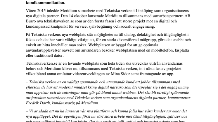 Våren 2015 inledde Meridium samarbete med Tekniska verken i Linköping som organisationens nya digitala partner. Den 14 oktober lanserade Meridium tillsammans med samarbetspartnern AB Burro nya tekniskaverken.se som är den första fasen i ett större projekt mot en digital och kundanpassad knutpunkt för service, självbetjäning och socialt engagemang.