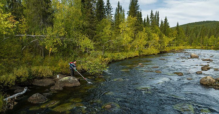 LKAB använder Metria Miljökoll. Lina tar vattenprov vid älv i Gällivare.