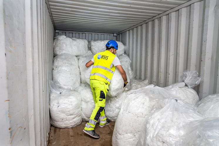 För att minimera transporten har lösullsisoleringen förvarats i plastsäckar, både i containers och inne i byggnaderna, under renoveringen.