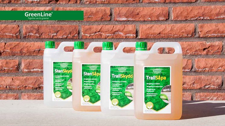 Förbered för vårens och sommarens uteliv med Greenline. Rengörings- och skyddsprodukter för trall och sten/betong rengör trädgården och uppfarten med omtanke om miljön. Naturlig såpa för rengöring och vattenglas för en skyddande effekt – så rengör du klimatsmart utan att använda starka produkter som kan skada kringliggande växtlighet.
