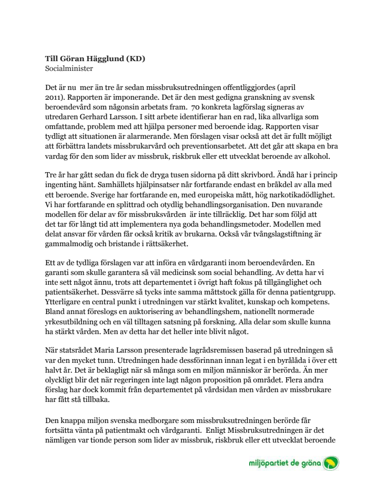 Det är mer än tre år sedan missbruksutredningen offentliggjordes (april 2011). Ändå har i princip ingenting hänt. Nu skickar miljöpartister ett öppet brev till socialminister Göran Hägglund (KD) med uppmaningen att ta frågan vidare.