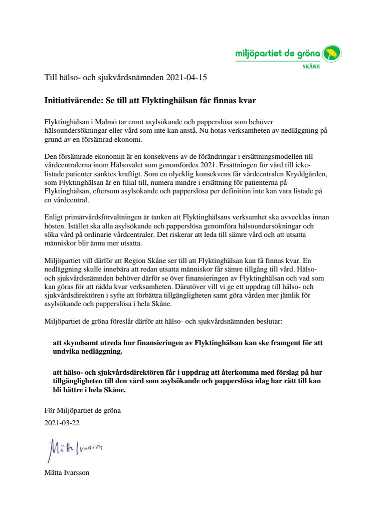 Initiativärende MP HSN Se till att Flyktinghälsan får finnas kvar.pdf