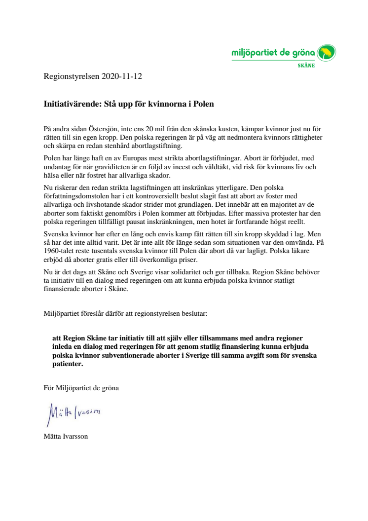 Miljöpartiet vill att polska kvinnor ska få göra subventionerade aborter i Skåne. Som ett första steg föreslår vi att Region Skåne inleder en dialog med regeringen om hur en finansiering kan se ut.