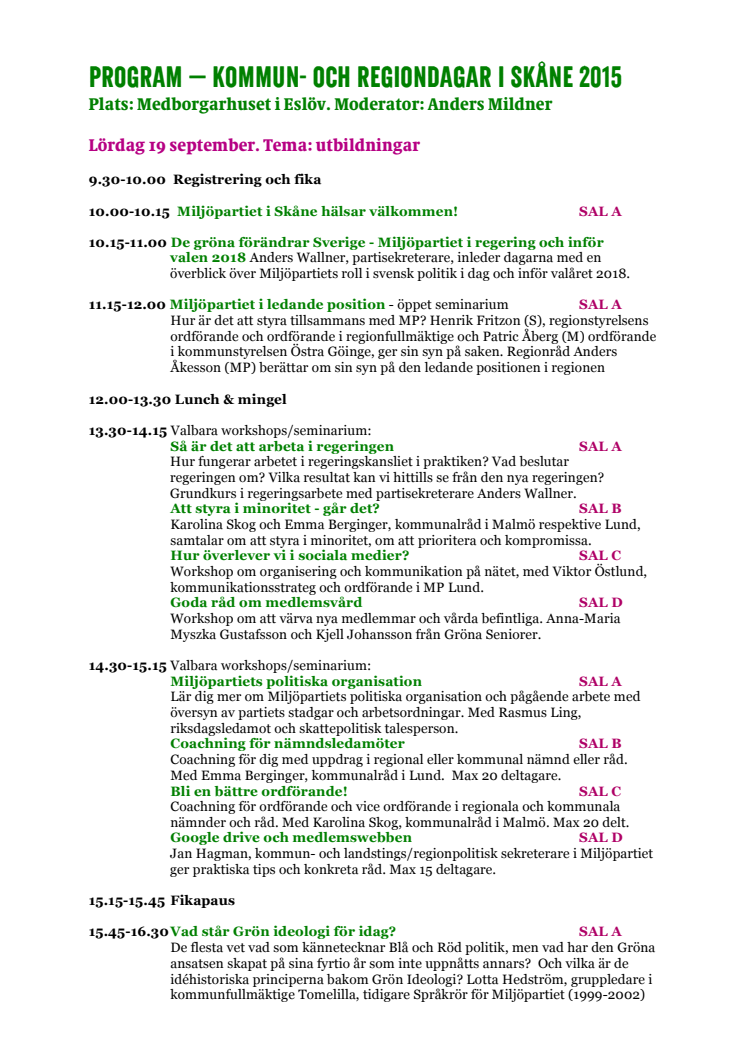 I helgen den 19-20 september arrangerar Miljöpartiet de Gröna i Skåne sina kommun- och regiondagar på Medborgarhuset i Eslöv. Det innebär två heldagar med inspiration, samtal och politik. På programmet står ett 20-tal paneldebatter, utbildningar, seminarier och föreläsningar med 40 inspiratörer, politiker, forskare och entreprenörer.