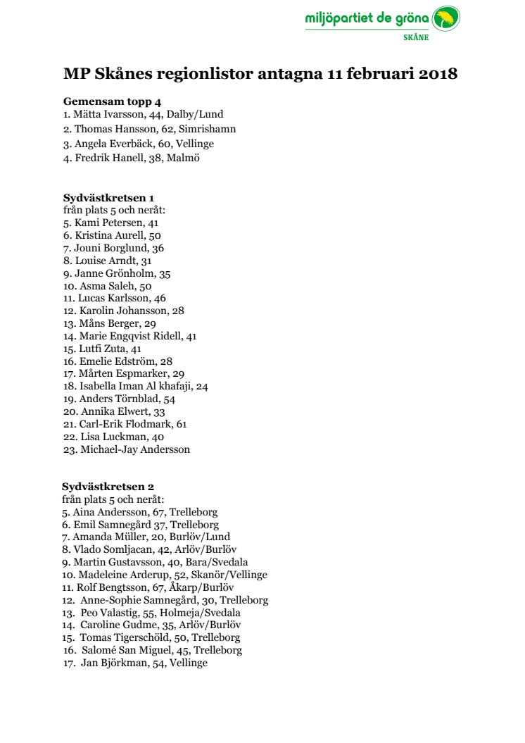 Regionlistorna för Miljöpartiet är klara. Under söndagen höll Miljöpartiet i Skåne valkonferens i Hässleholm. De fyra toppkandidaterna till regionfullmäktige är desamma på samtliga sex listor.