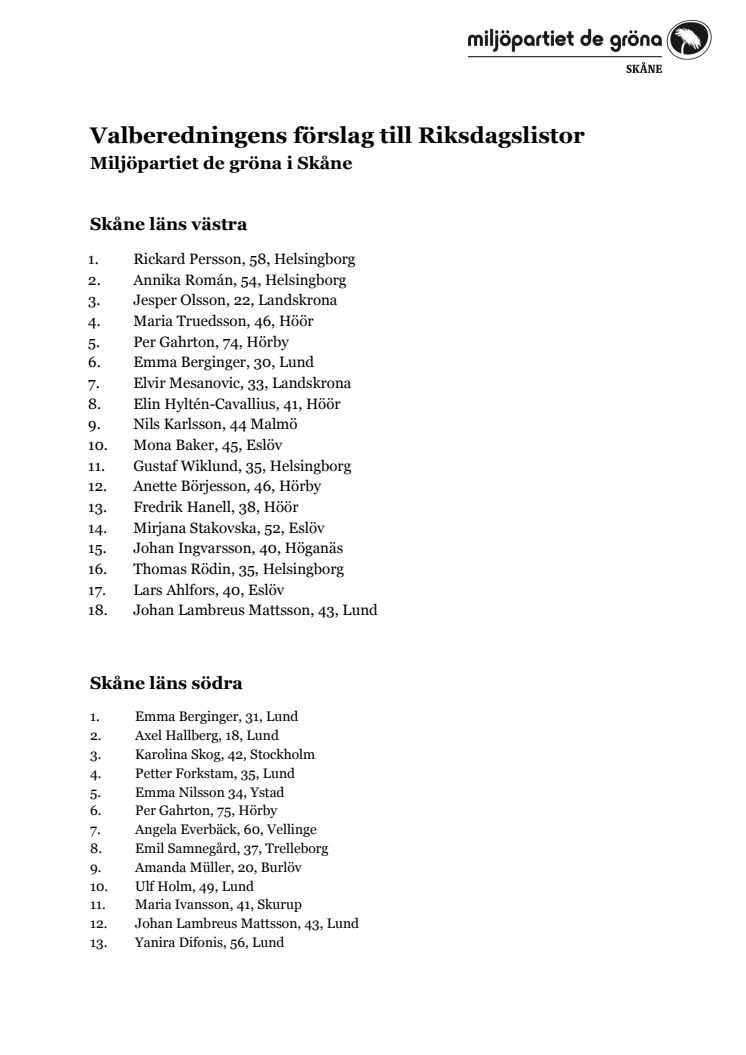 Valberedningens förslag till riksdagslistor