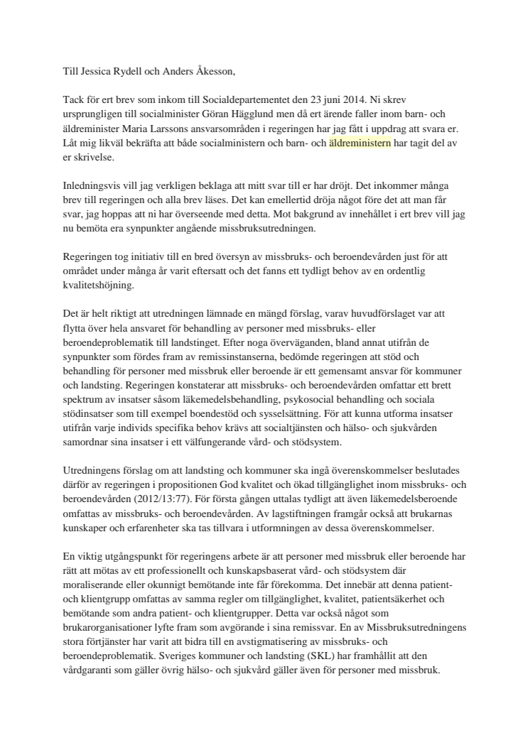 I slutet av juni landade ett brev hos regeringskansliet i Stockholm. Som avsändare stod två miljöpartistiska regionråd, Jessica Rydell och Anders Åkesson, från landstinget i Kalmar respektive region Skåne. Anledningen till brevet var den mycket omfattande missbruksutredning som tre år tidigare slutförts (april 2011). Rapporten är den hittills mest gedigna granskning av svensk beroendevård som någonsin arbetats fram. Dess slutsatser rör en knapp miljon svenskar, dvs nära var nioende person.
