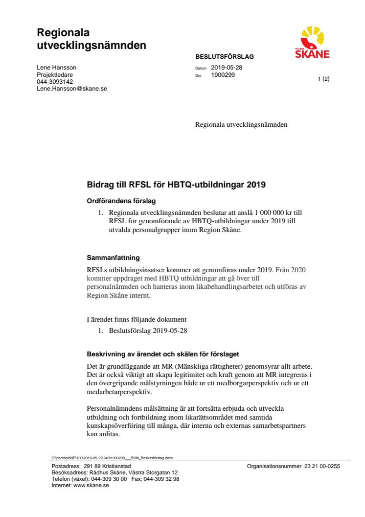 Beslutet idag innebär att Alliansen fortfarande står fast vid att avveckla utbildningen. Efter utbildningsinsatserna 2019 avslutas samarbetet med RFSL. Istället ska en annan typ av HBTQ-utbildning ske som del av ett större likarätts-arbete i personalnämnden, med kraftiga besparingar som följd. Från att Region Skåne tidigare lagt en miljon kronor enbart på den nuvarande HBTQ-utbildningen ska nu 900 000 kronor täcka både HBTQ-utbildning och det likarätts-arbete som redan pågår.